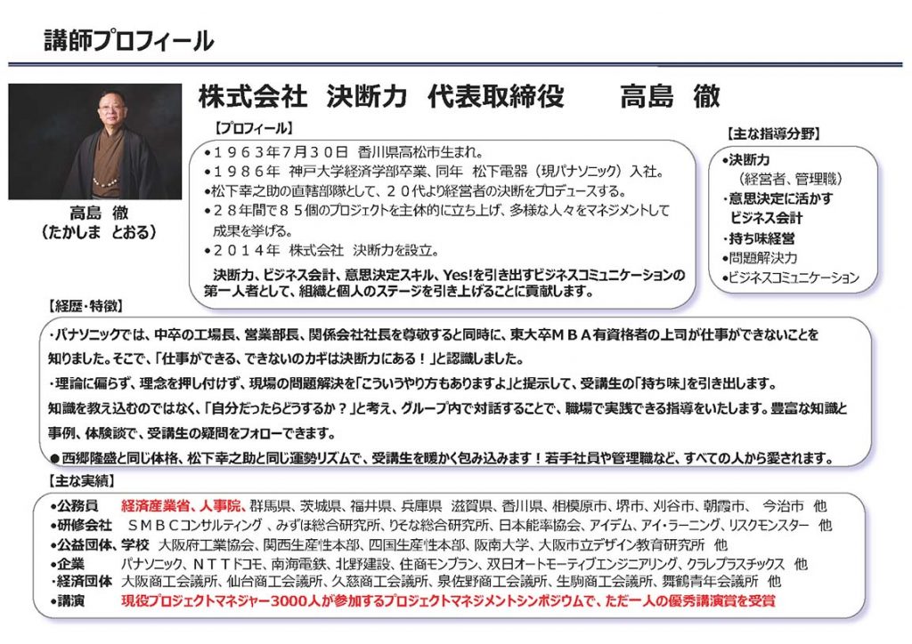 | 1963年7月30日 香川県高松市生まれ。 1986年 神戸大学経済学部卒業、同年 松下電器(現パナソニック)入社。 松下幸之助の直轄部隊として、20代より経営者の決断をプロデュースする。 28年間で85個のプロジェクトを主体的に立ち上げ、多様な人々をマネジメントして成果を挙げる。 2014年 株式会社 決断力を設立。決断力、ビジネス会計、意思決定スキル、Yes!を引き出すビジネスコミュニケーションの第一人者として、組織と個人のステージを引き上げることに貢献します。 ・パナソニックでは、中卒の工場長、営業部長、関係会社社長を尊敬すると同時に、東大卒MBA有資格者の上司が仕事ができないことを知りました。そこで、「仕事ができる、できないのカギは決断力にある!」と認識しました。 ・理論に偏らず、理念を押し付けず、現場の問題解決を「こういうやり方もありますよ」と提示して、受講生の「持ち味」を引き出します。知識を教え込むのではなく、「自分だったらどうするか?」と考え、グループ内で対話することで、職場で実践できる指導をいたします。豊富な知識と事例、体験談で、受講生の疑問をフォローできます。西郷隆盛と同じ体格、松下幸之助と同じ運勢リズムで、受講生を暖かく包み込みます!若手社員や管理職など、すべての人から愛されます。 |